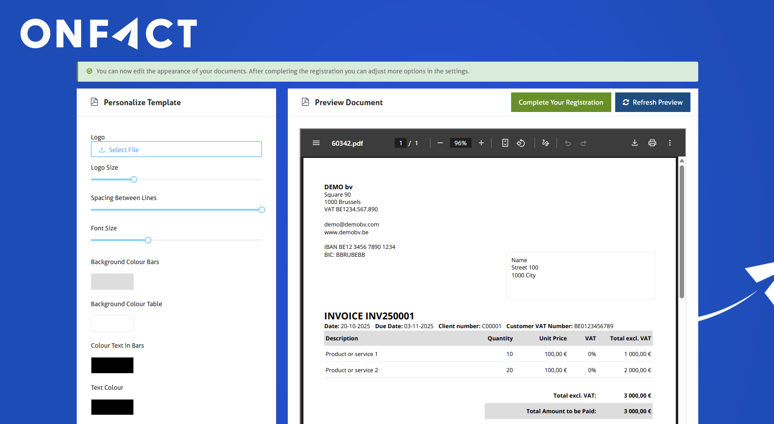 In order to create your first invoice immediately, some additional company details are required. These will be displayed on your invoice. As you fill in more details, you will see the preview in the top right corner become more complete. Once you have filled in your details, click on the ‘Complete your registration’ button at the bottom.